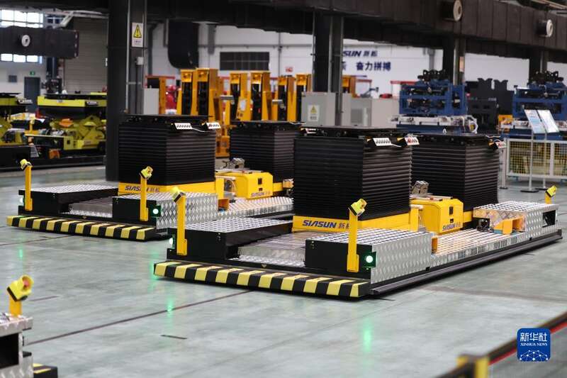 这是在沈阳新松机器人自动化股份有限公司拍摄的双举升合装移动机器人。新华社记者 潘昱龙 摄
