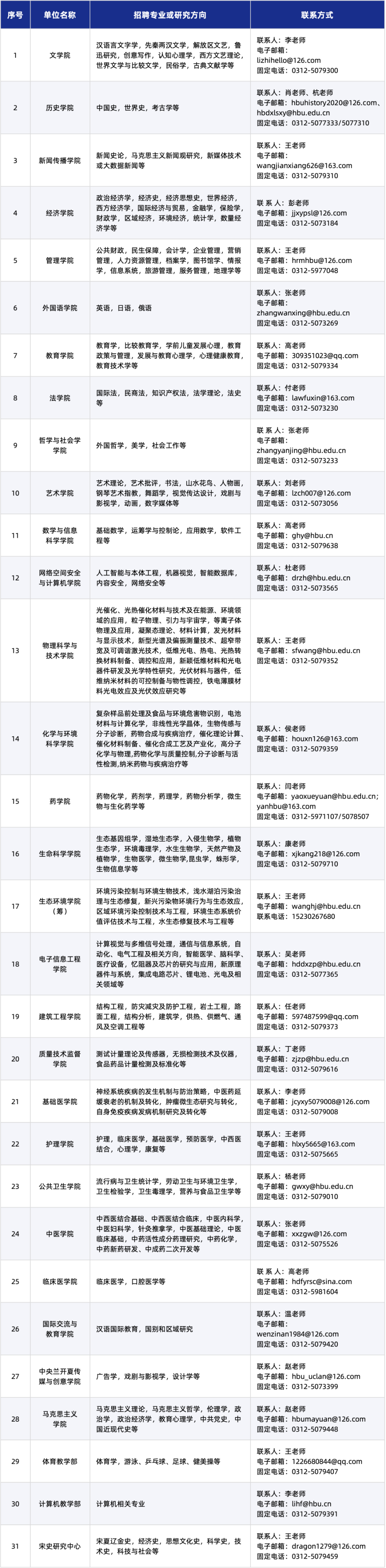 各教学科研单位联系方式