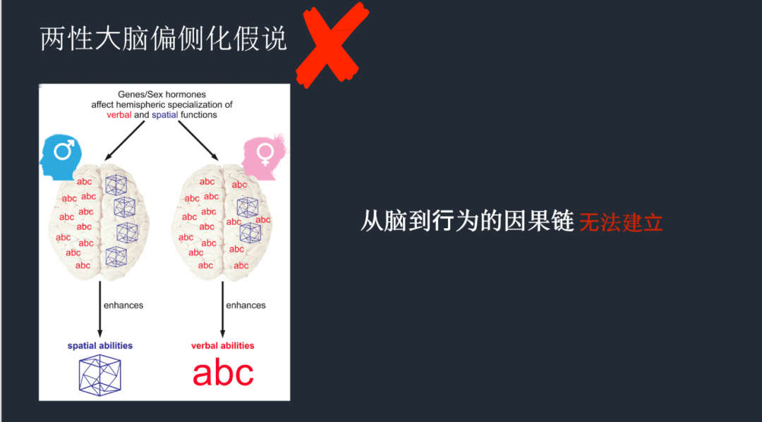 科学家还发现,无论是利用行为测量还是结构测量,语言能力和大脑对称之间都没有一致性的结果。即,大脑对称性和语言能力之间并不存在因果关系。所以,大脑偏侧化假说用大脑的连通性来解释男女之间的差异,也是一门“伪科学“。