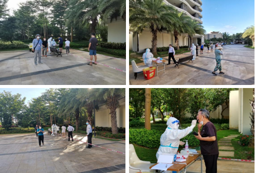 核酸采样是疫情防控的重点工作 ,具有任务重、强度高、节奏快和危险性大等特点。刘亚老师穿上“大白”套装,并让同事在后背上写下了“海南加油”的字样后,便迅速投入到紧张的核酸采样工作中。刘亚老师与队友首先以最快的速度完成300余人的集中采样工作,然后上门对“黄码”人员进行单管单采。持续4个多小时的高强度采样,汗水早已浸湿他的衣服。当他脱下防护服休息时,同事开玩笑地说道:“刘老师成了‘落汤鸡’啦”。“对呀,但我不是普通的‘落汤鸡’,我是阳光下的‘落汤鸡’”,刘老师笑着回答道。