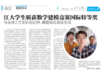 这时,团队成员发来新的竞赛邀请,马睿洁决定放下负担,全新出发,美国大学生数学建模竞赛走进了她的生活。两个月以来不间断地训练,作为团队的写作手,她撰写练习论文9篇,总字数超过17万字,正式比赛更是四天四夜的连轴奋战,与队友们在线交流累计超过80小时。最终从四千多支队伍中脱颖而出,荣获特等奖,实现了我校在该赛事最高奖项上零的突破,也在国际舞台上发出了属于江南的声音。