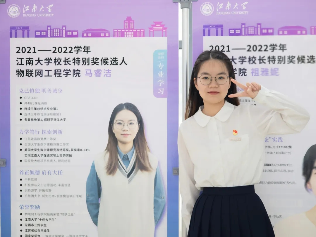 马睿洁,中共党员,江南大学物联网工程学院2018级自动化本科生。四年间,马睿洁以“养正至善,行在当下”作为自身的行动指南,秉持着物联人“唯实”的精神,力学笃行,探索创新,先后获得国家奖学金、江苏省优秀毕业生、江南大学“校长特别奖”等荣誉奖励,现已保研至浙江大学深造。