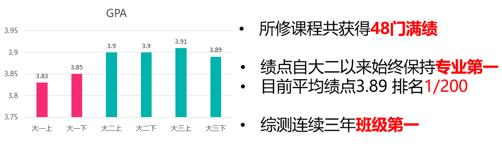 本科期间马睿洁平均绩点3.89,所修课程共获得48门满绩,学业成绩常年专业第一,综合测评班级第一。