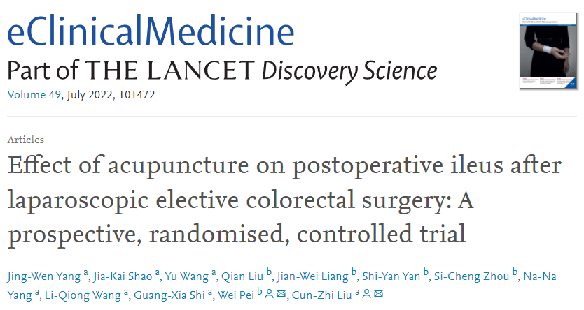 近日,我校针灸推拿学院刘存志教授领衔的项目《针刺治疗腹腔镜结直肠癌切除术后肠麻痹的前瞻性、随机对照临床试验》在Lancet子刊EClinical Medicine(JCR分区Q1,IF=17.033)上发表,研究表明针刺能够显著促进腹腔镜结直肠癌切除术患者的术后胃肠功能恢复。我校针灸推拿学院杨静雯副教授为论文的第一作者,刘存志教授和中国医学科学院肿瘤医院裴炜副主任医师为共同通讯作者。这项工作得到了国家重点研发计划和国家杰出青年科学基金的支持。