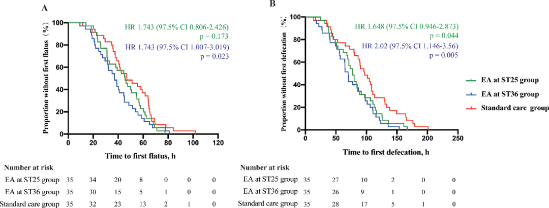 术后肠麻痹是腹部手术后发生的胃肠动力障碍性疾病,可能增加术后并发症的发生率、延长住院时间、增加住院花费,给患者和医疗保健系统造成严重负担。随着加速康复外科(ERAS)理念和微创手术的广泛应用,患者术后胃肠功能恢复得到一定改善,但仍需要配合其他干预手段进行治疗。研究在中国医学科学院肿瘤医院纳入105例腹腔镜结直肠癌切除术患者,按照1:1:1比例分为3组,在标准治疗(ERAS路径下的术后护理)基础上,分别接受连续4天电针足三里穴干预、电针天枢穴干预、或不接受电针干预。结果显示,与单纯标准治疗相比,电针足三里穴能够显著缩短患者首次排气时间10.98小时、首次排便时间25.41小时;电针天枢穴对患者的胃肠功能也有一定改善趋势,将患者的首次排气时间缩短5.54小时,首次排便时间缩短17.69小时,但组间无统计学差异,这可能与样本量较小、腹部和肢体部腧穴存在不同适宜针刺参数有关。此外,电针足三里或天枢穴均能显著缩短患者耐受半流质饮食时间,表明针刺对上消化道功能恢复也具有促进作用。