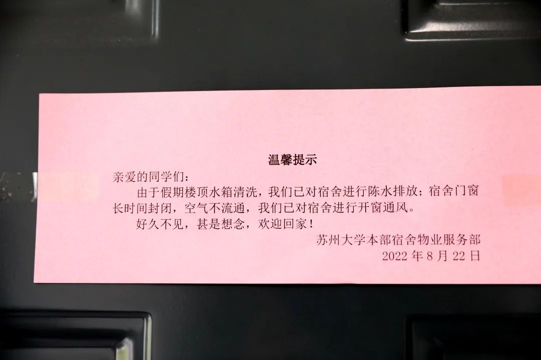 为迎接同学们返校,宿管阿姨和大叔也是“摩拳擦掌”做足了准备。本部新5学生宿舍施阿姨说:“同学们返校前,我们为宿舍提前开窗通风、打扫了宿舍卫生、做了空调清洗,及时做好宿舍水电等维护工作,希望尽我们的绵薄之力让同学们有回家的感觉。”