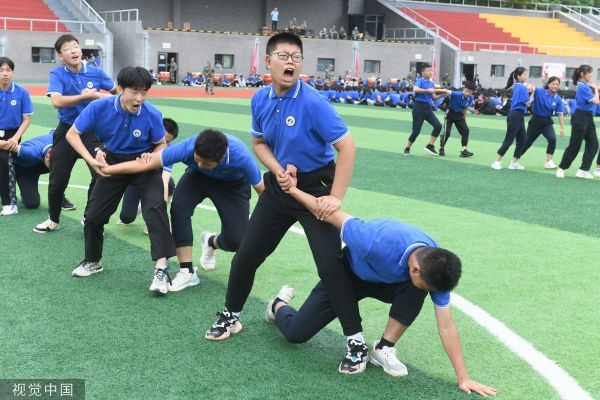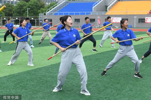 2022年8月29日,安徽阜阳,第三中学的高一新生在军训现场练习应急棍术。