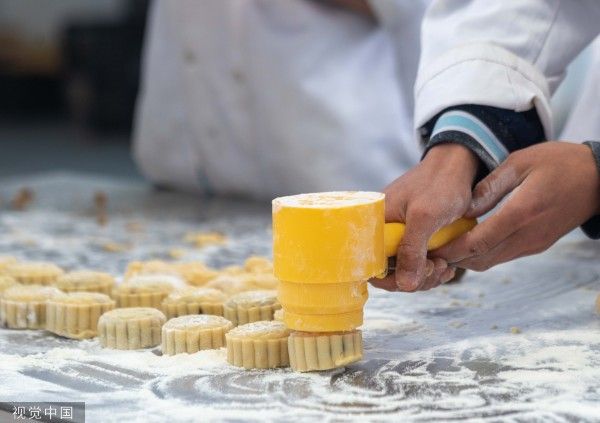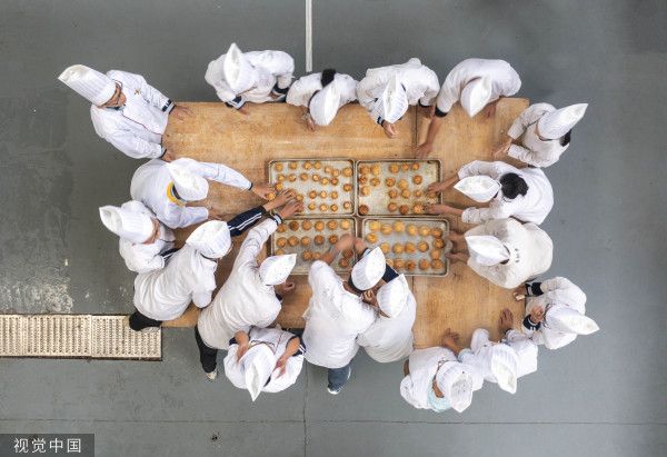 2022年8月29日,山西运城,教师节即将来临之际,万荣县职教中心烹饪专业的学生们在老师的指导下,共同为老师制作“甜”心的枣泥月饼,共迎即将到来的教师节和中秋节。