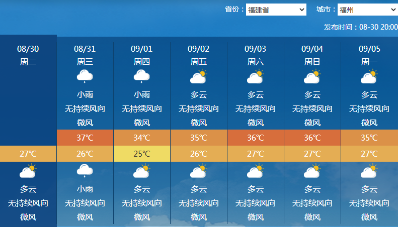福州8月30日往后7天里5天报了35℃以上高温
