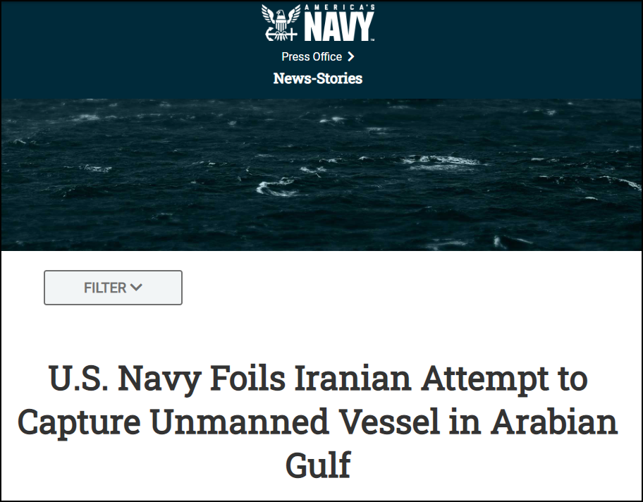 美国第五舰队称,在伊朗时间29日晚11点,于“阿拉伯湾(美国海军对波斯湾的称法)中部的国际海域”发现伊朗革命卫队海军辅助舰“烈士巴扎尔”号(Shahid Baziar)正在拖走一艘美军的“探索者”式无人帆船(Saildrone Explorer)。美军随后出动巡逻海岸舰艇“雷电”号(USS thunderbolt),一架MH-60S“海鹰”直升机和一艘小船前往该海域。
