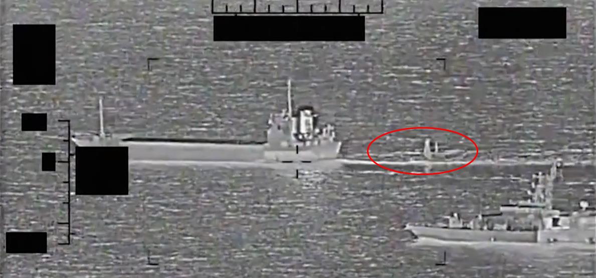 美国海军公布的图像,显示“烈士巴扎尔”号正在拖走无人帆船