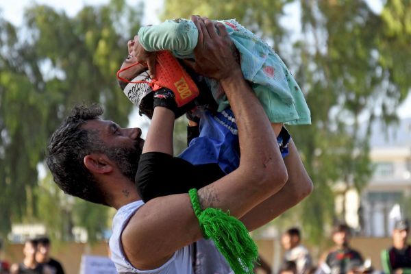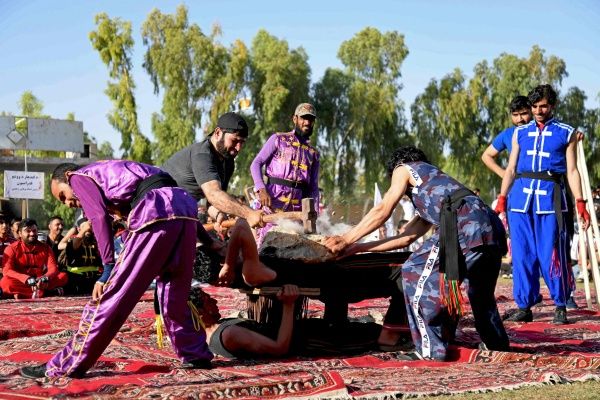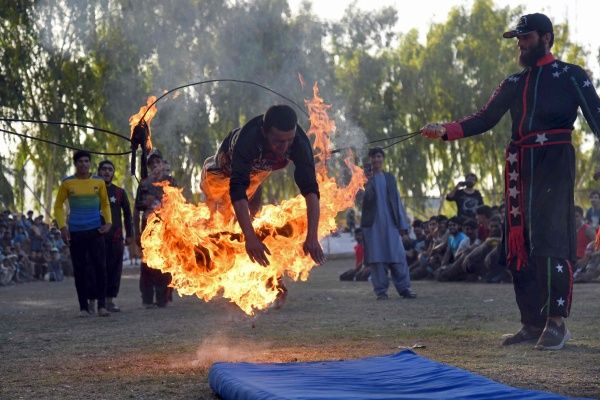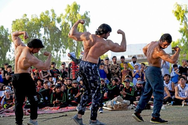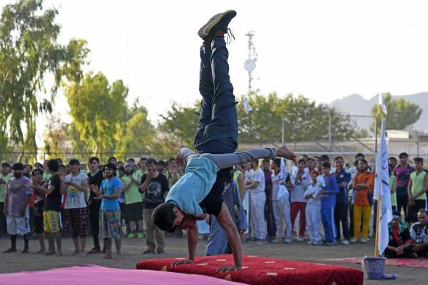 阿富汗庆祝美军撤离一周年 街头上演胸口碎大石