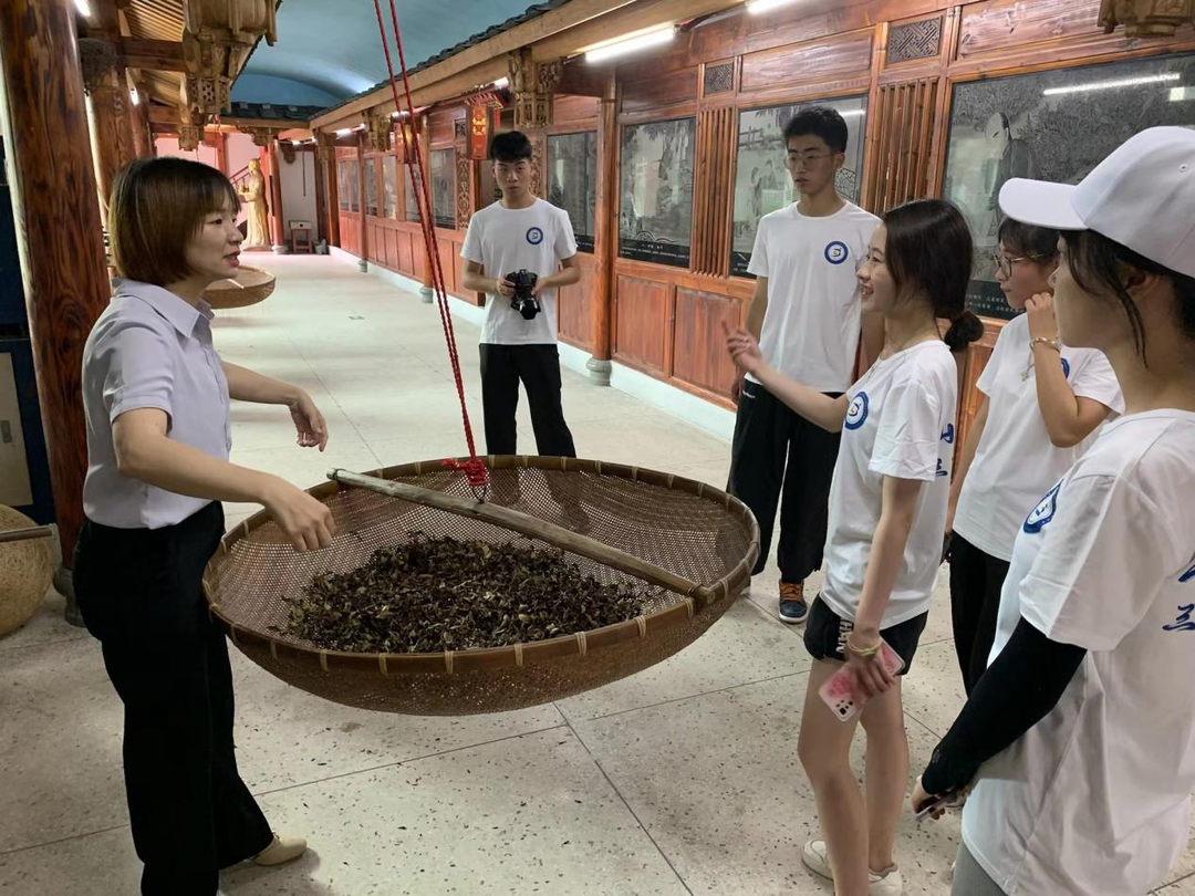 图为魏荫名茶工作人员为实践队讲解制茶工序