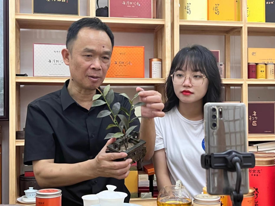 图为实践队队员在直播过程中与观众分享茶园管理知识