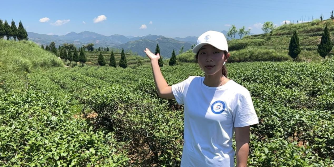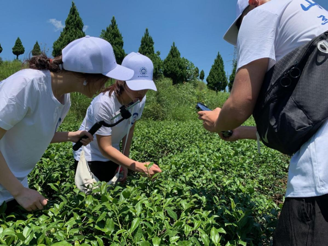 图为实践队队员在茶园现场直播教学茶园植树知识