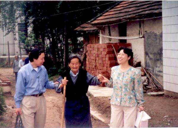 1997年,苏智良、陈丽菲在崇明岛探望幸存者陆秀珍老人。