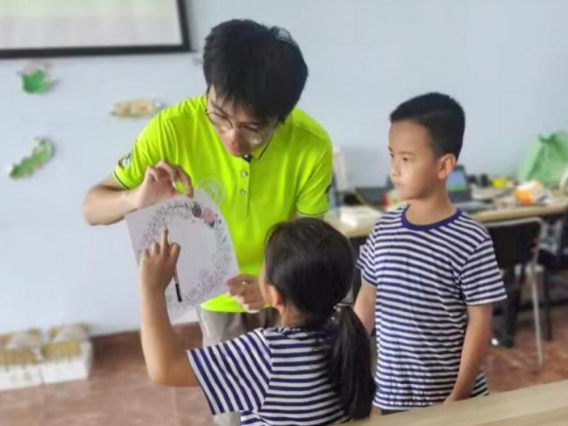 图为实践队员为小朋友讲解彩绘曼陀罗小游戏
