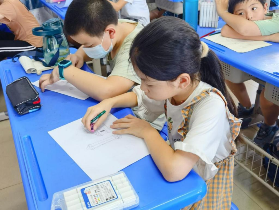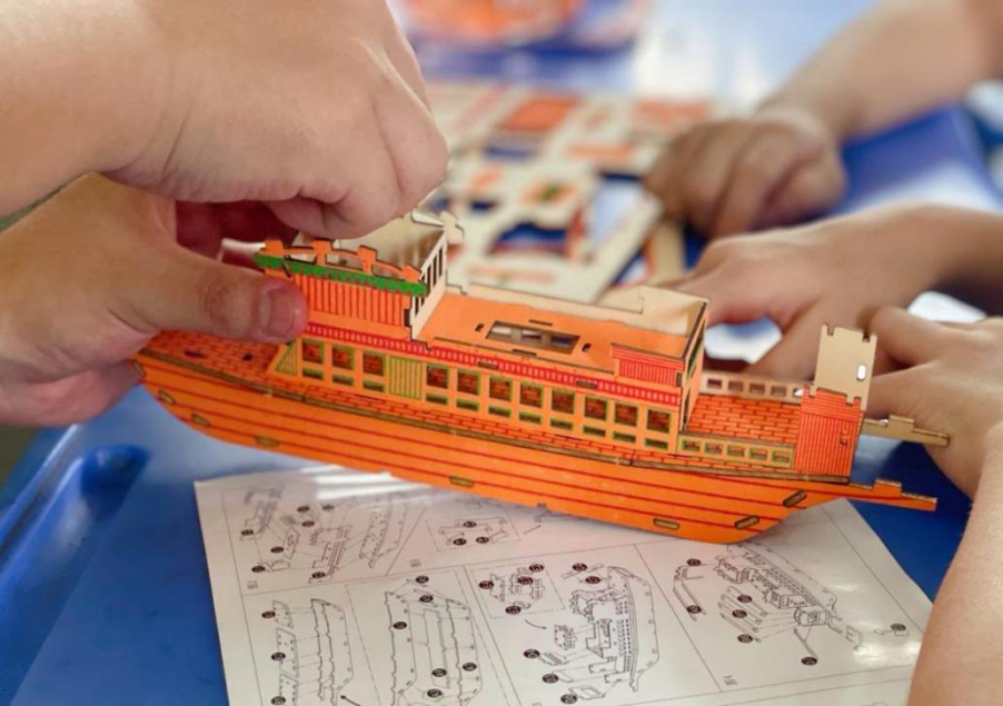 忆往昔峥嵘岁月。从嘉兴南湖那一叶小舟飘摇启程,到如今乘风破浪的福建舰,沧海桑田,神州巨变。变化的衣食住行彰显进步,堆砌的一砖一瓦见证转变。模型课上,小朋友们跟着支教队成员王泽轩老师拼接一个一个模型零件,使红船能跨越历史重新出现在大家手中,跟着支教队成员王致知老师和袁夏鑫老师的步伐在中共一大至改革开放间穿梭。乡土课上,小朋友们跟着姜雪老师了解船政文化历史,回顾造船厂、办学堂、兴军舰、试飞机……此外,小朋友们还通过照片对比今昔,通过画笔临摹建筑,聚焦本土特色,探索福州船政文化。