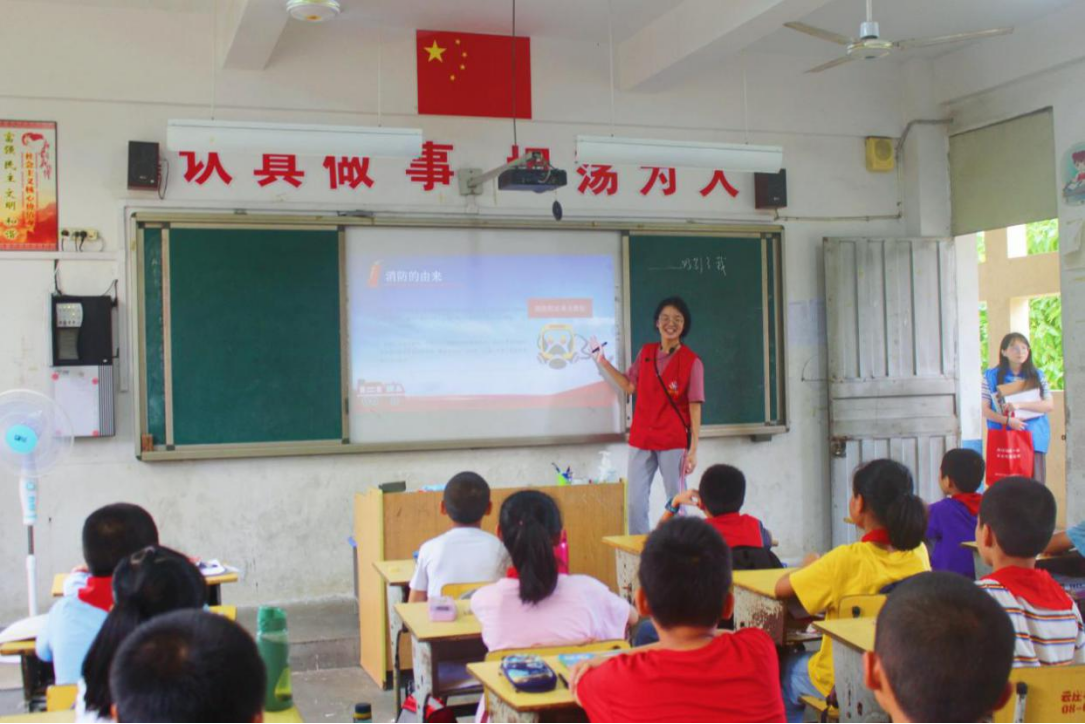 图为实践队宣讲人为孩子们讲解消防安全理论知识