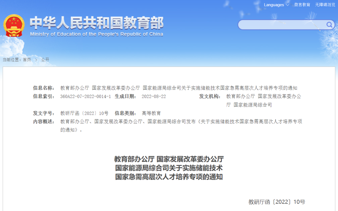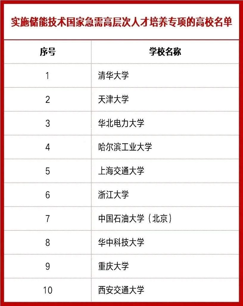 8月31日,教育部网站发布《教育部办公厅 国家发展改革委办公厅 国家能源局综合司关于实施储能技术国家急需高层次人才培养专项的通知》。天津大学入选实施储能技术国家急需高层次人才培养专项高校名单(全国仅10所)。