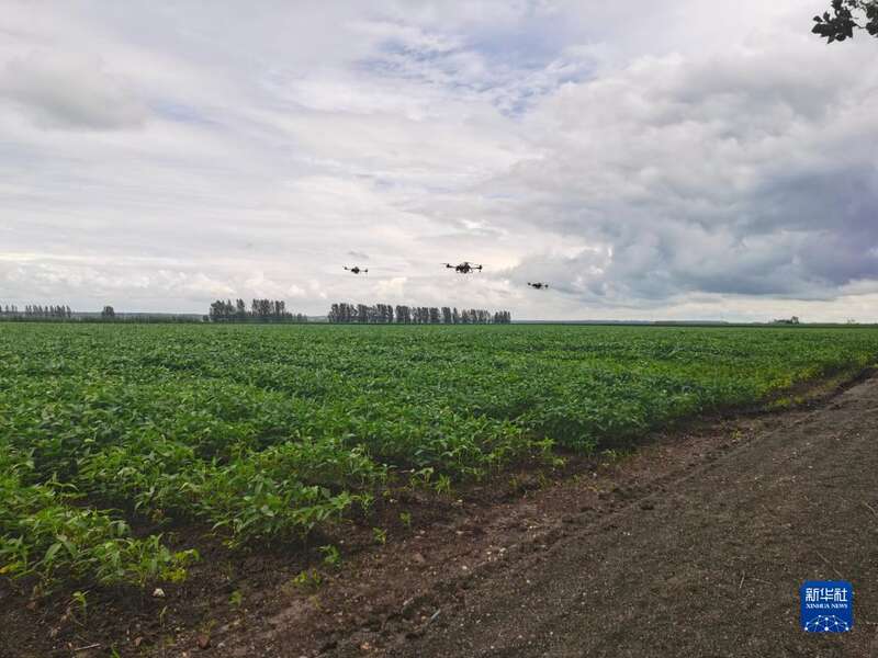 无人机在海伦市东风镇临河村大豆种植园区作业(资料照片)。新华社发
