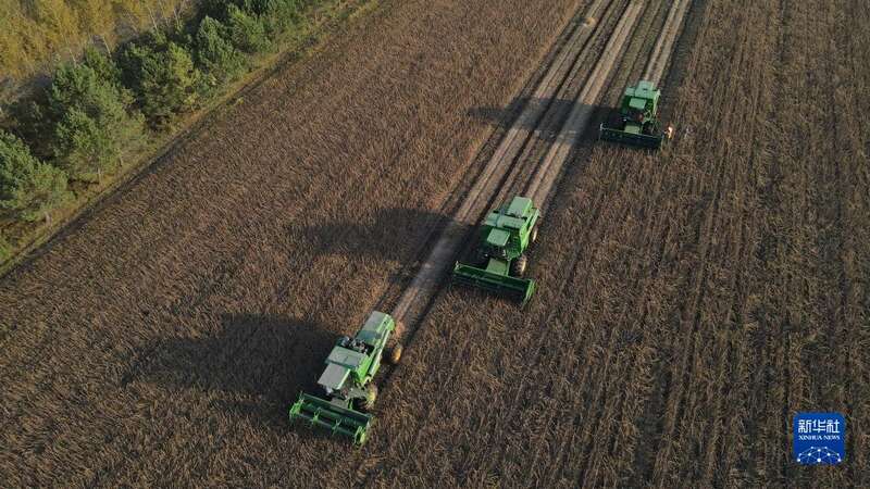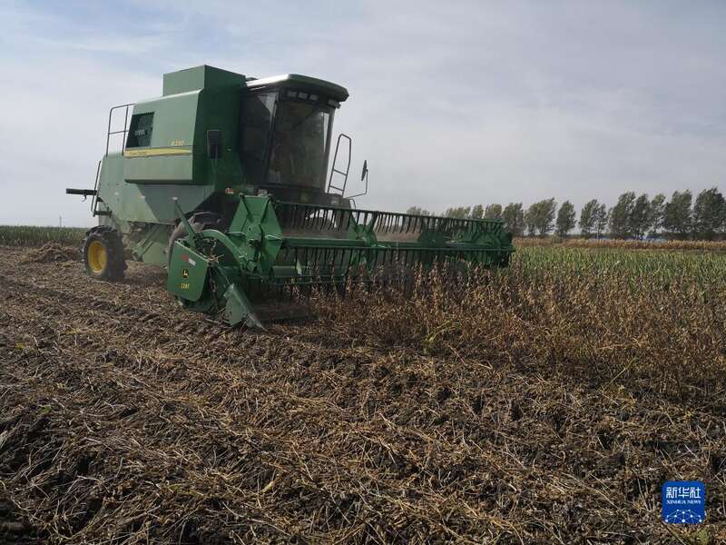 收割机在海伦市一大豆种植园区作业(资料照片)。新华社发