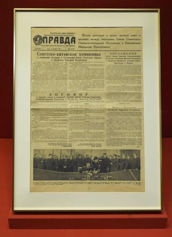 为迎接习近平这次到访,俄方在国礼上颇费了一番心思。礼物由普京亲手挑选,是一张出版于1950年2月15日的《真理报》。泛黄的旧报纸镶嵌在金色相框中,记录着两国交往史上一个重要时刻——