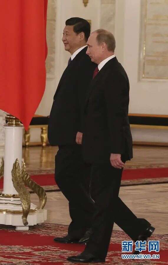 2013年3月22日,在克里姆林宫前,俄罗斯总统普京与30多名政府高官组成“超豪华”阵容,专程迎接一位尊贵的客人——新任中国国家主席习近平。