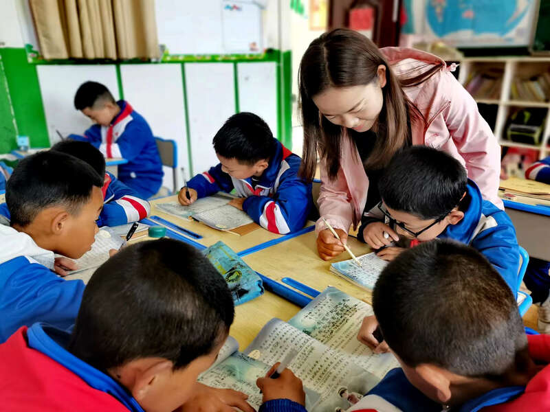 2022年6月15日,云南省迪庆藏族自治州香格里拉市格咱乡小学四(1)班教室里,王洁老师正在辅导学生。央几/摄