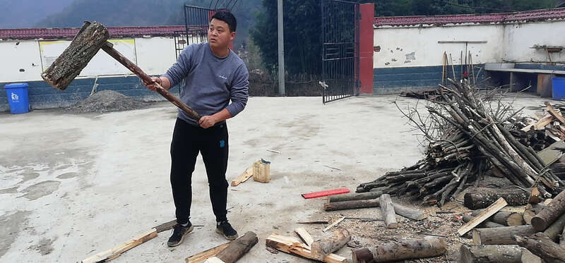 2019年10月30日,四川省万源市蜂桶乡小学阴坡村学校,吴海毅老师在劈柴,为了确保冬季大雪封山后孩子们在学校有可口的午餐和温暖的火炉。据介绍,当地位于万源市最偏远的地方,海拔1200米,11月以后,下雪后车辆无法行驶。吴海毅/供图