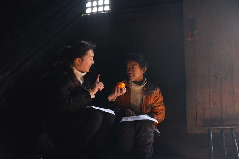 2020年12月21日,湖南省怀化市沅陵县明溪口镇芙蓉学校的送教团队来到近岩溶村,为当地的孩子们带来一堂特别的数学课,杜远薇老师正在教一位残疾儿童用橘子数数。 黄倩/摄