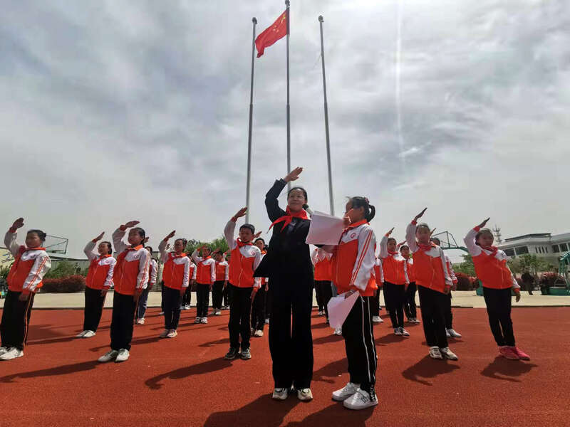 2022年5月31日,山东省曲阜市王庄镇中学,少先队入队仪式上,辅导员孔潇茹老师带领老队员教新队员行队礼。据介绍,该校是当地的一所九年一贯制学校。 孔德帅/摄