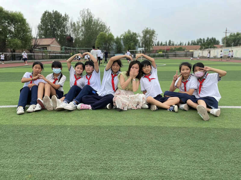 2022年7月12日,天津市宁河区七里海镇薄台小学,本学年最后一天,同学们和张亚男老师一起坐在操场上合影留念。 张亚男/供图