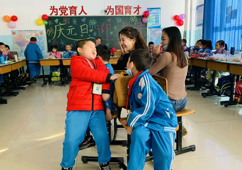 2021年12月31日,新疆维吾尔自治区塔城地区裕民县吉也克镇牧业寄宿制中心小学二年级举行“庆元旦,迎新年”文艺活动,师生们一起做游戏。王佳睿/摄
