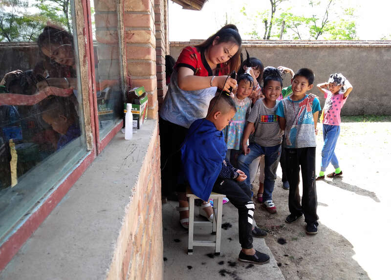 2017年9月6日,位于甘肃省天水市太京镇偏远山区的马岐山小学,上午的课结束后,乡村支教老师马保全正在帮马博同学理发,其他同学上前围观。 柏雪/摄