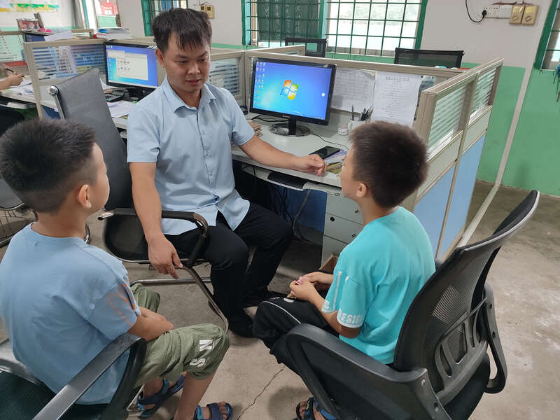 2022年8月31日,广西壮族自治区贵港市港南区桥圩镇青塘小学,刚担任四年级班主任的梁少龙老师在学校办公室了解学生的家庭和学习情况。 黄莲花/摄