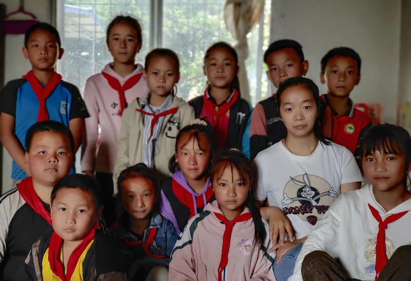 2021年11月24日,四川省雷波县宝山镇中心校,宗加慧老师放弃产假回到学校复课。学生们跑到宿舍,争先恐后和老师合影留念。 宗加慧/供图