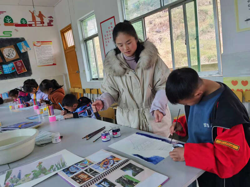 2020年12月11日,贵州省贵定县昌明镇岩下小学,罗雄英老师带着几个平时爱好美术的学生在学校的画室画画。 罗雄英/供图