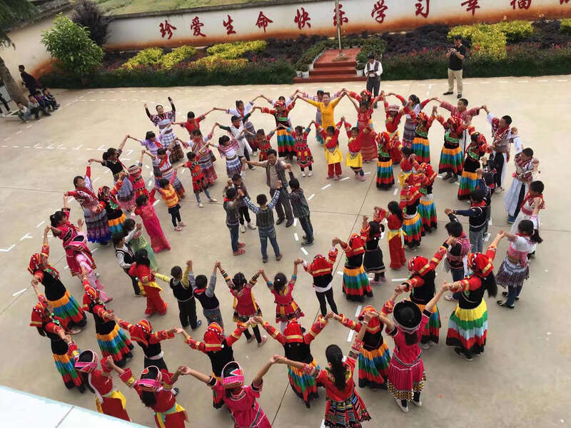 2018年6月1日,云南省楚雄彝族自治州禄丰市勤丰镇洋溪冲小学,老师和学生们手拉手跳着欢快的彝族舞蹈,庆祝“六一”国际儿童节。 朱晓花/摄