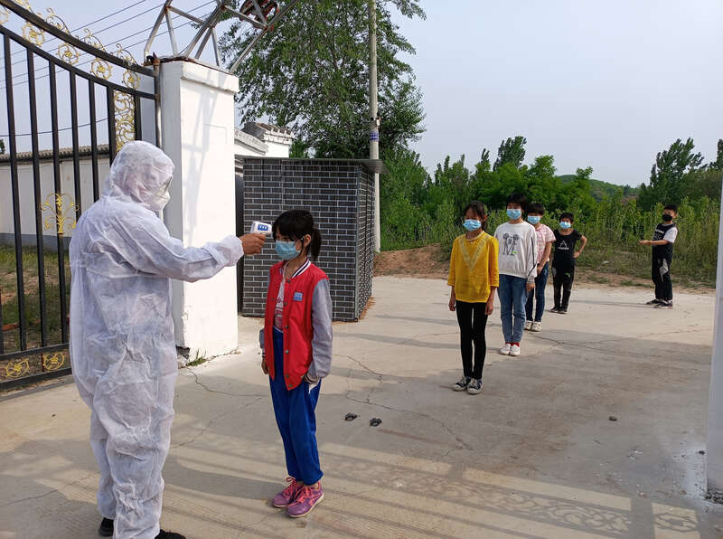 2022年5月18日,河北省石家庄市阳泽乡严华寺小学在校门口进行新冠疫情防控演练。李老师身穿防护服,给学生们测体温。 牛金光/摄