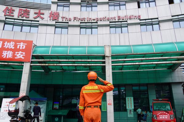 2022年9月7日,四川甘孜,苟磊向母亲住院的病房敬礼,祈望妈妈安好。