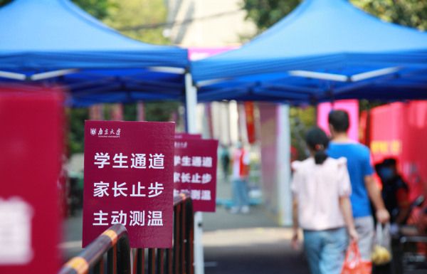 为保障新生顺利报到,南京大学为送学家长安排专场核酸检测,高年级学生披上红马甲协助新生搬运行李。