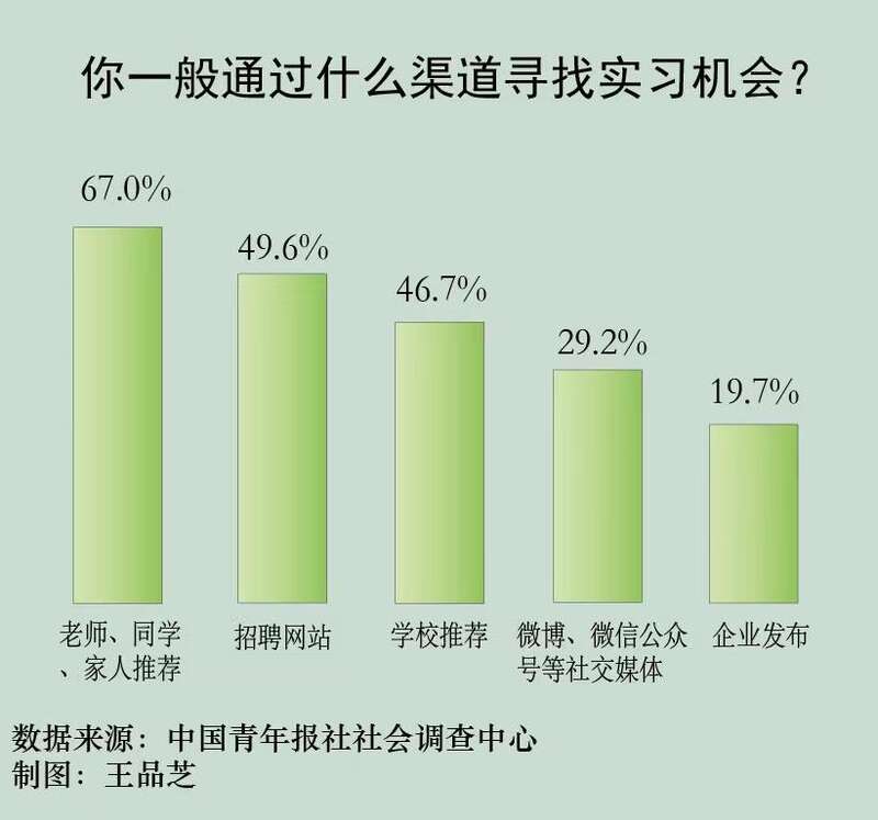 日前,中国青年报社社会调查中心联合问卷网(wenjuan.com),对2007名大学生进行的一项调查显示,67.0%的受访大学生通过老师、同学、家人推荐寻找实习机会,其他还有:招聘网站(49.6%)、学校推荐(46.7%)、微博微信公众号等社交媒体(29.2%)、企业发布(19.7%)等。