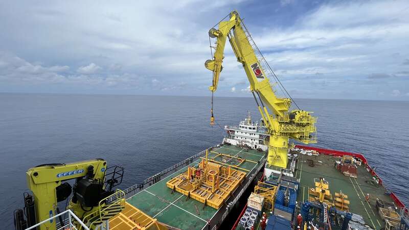 深水水下采油树,运抵海上钻井平台正在下水安装。