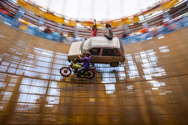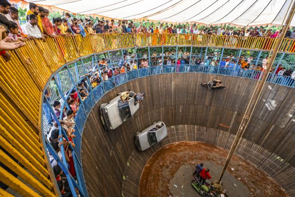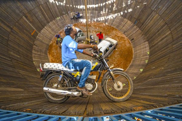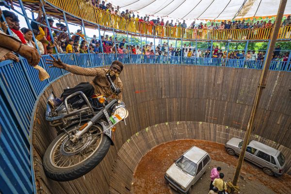 印度Tarnetar,不怕危险的骑手在“死亡之墙”上表演、。37岁的平面设计师Saurabh Sirohiya表示:“这个设施可以被称为死亡之井,也可以被称为死亡之墙,这项表演是一项挑战死亡和重力的杂技,只有在印度各地的嘉年华或集市上才能看到,但受欢迎程度正在逐渐下降,观众会拿着钱让表演者抢,骑手将会骑到很高的地方,以便拿到更大面值的钱,而忽略观众手中面值小的钱。骑手从设施底部厨房,通常是逆时针方向旋转,沿着开始的坡道斜着向上骑,直至达到一定的速度,可以将车辆与设施标明平行。在此期间,骑手还将表演其他的杂技,例如撒把骑行等。尽管这项工作非常危险,但依然有乐意参与的骑手。”