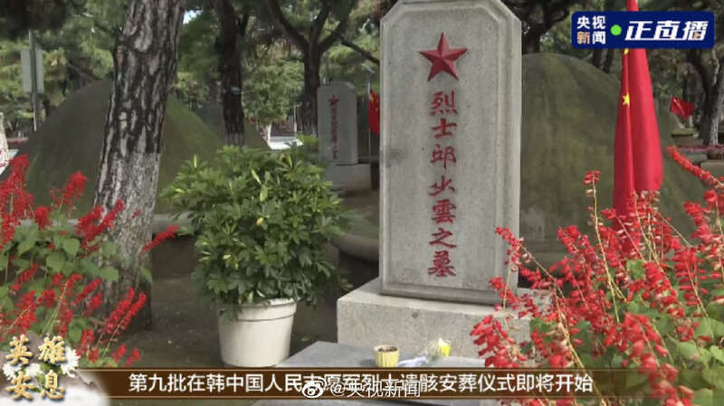 今天,第九批在韩志愿军烈士安葬仪式举行。在沈阳抗美援朝烈士陵园,烈士邱少云安葬在这里,他的墓碑边开满鲜花。传递!致敬!
