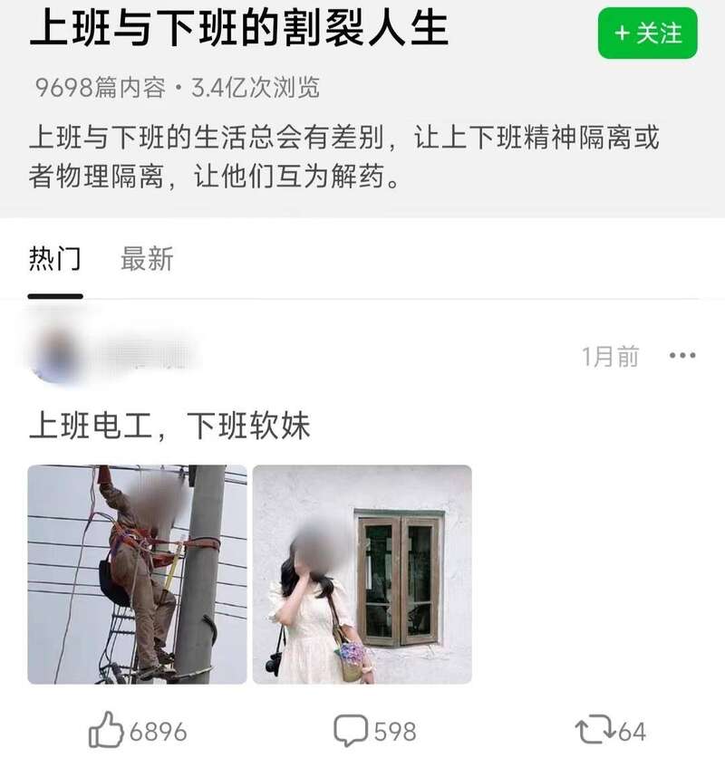 到目前,该话题已经突破了3.4亿次的浏览量。不少网友发图“炫”出他们上下班的不同状态:前者是一身工装爬电线杆的勤劳电工,后者是穿着素雅小白裙、爱拍照、爱探店的可爱小萌妹;前者是捂得严实合缝素颜女教师,后者是妆容精致、爱听音乐会的潮流女孩;前者是沧桑疲惫的科研技术人员,后者是爱好体育的阳光男孩……