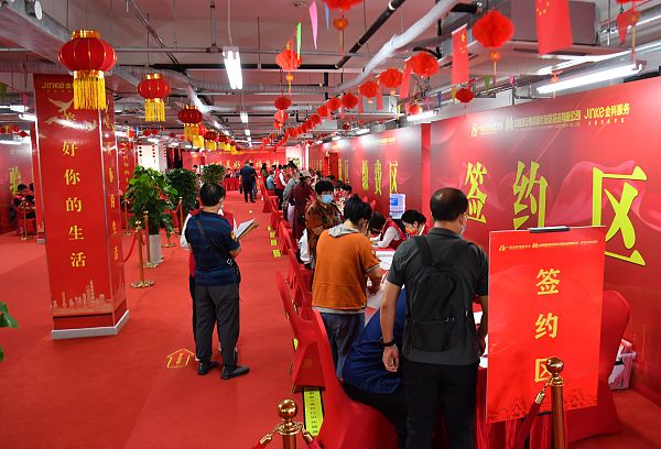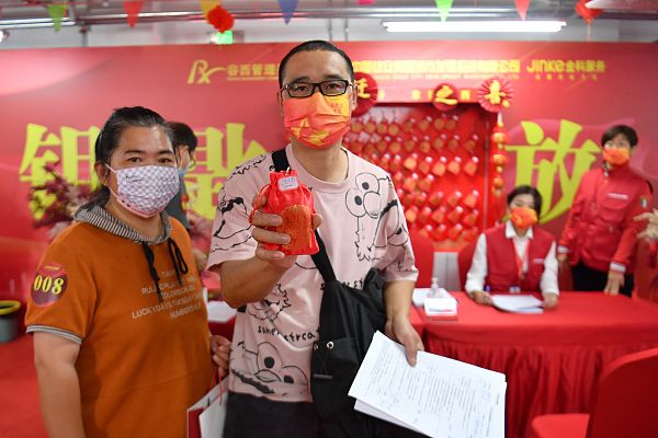 2022年9月17日,河北雄安新区,中铁建设容西C3标段清泉社区第三交付网点交付现场回迁居民展示新房钥匙。容西片区首批安置房回迁验房交付工作正式启动。本次集中验房交付的时间为9月17日至9月26日,首批分配19111套安置房。这是雄安新区继容东片区、雄东片区A单元之后实施回迁安置的第三个新建回迁片区。