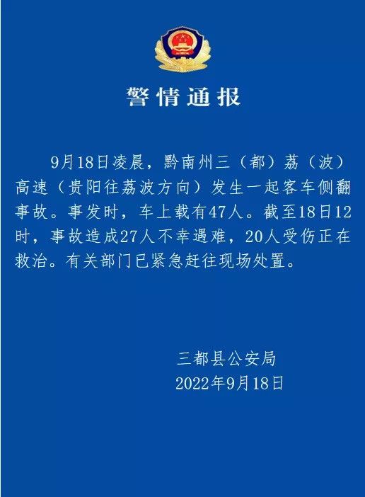 贵州一载47人大巴发生侧翻事故,致27人遇难。