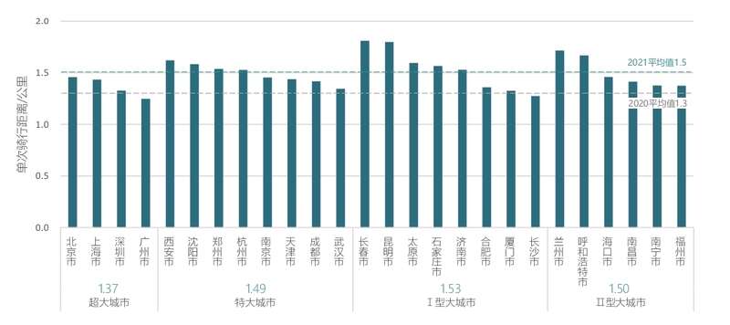 报告显示,我国主要城市共享单车单次骑行平均距离为1.5公里,对比2020年增加140米,兰州、沈阳、郑州增幅超过200米。相较2020年,共享电单车单次骑行距离2.4公里,青岛、重庆等4个城市呈上升趋势,分别增加为430米、220米;贵阳、昆明等4个城市呈下降趋势,分别减少为290米、190米。